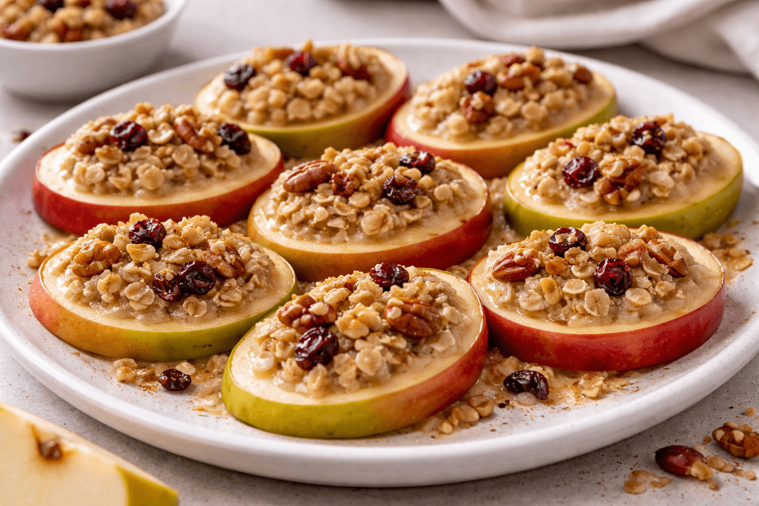 Cuando buscas algo más reconfortante, una versión tibia marca la diferencia. Basta con calentar la manzana unos minutos para que se ablande ligeramente. Luego, la avena, la canela y los frutos secos aportan textura y hacen que el resultado se acerque a un postre sencillo, sin complicarse.