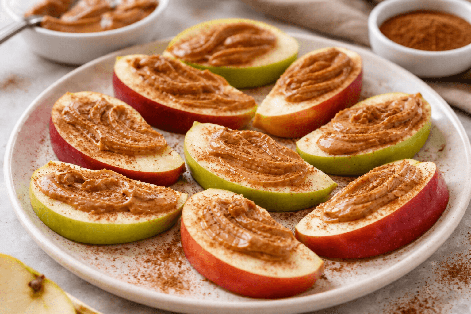 Los gajos medianos hacen que la manzana sea más fácil de manipular. Una capa ligera de crema de cacahuate y un toque de canela cambian por completo el bocado. La mezcla aporta cremosidad y hace que el sabor se sienta más redondo, sin necesidad de añadir azúcar.