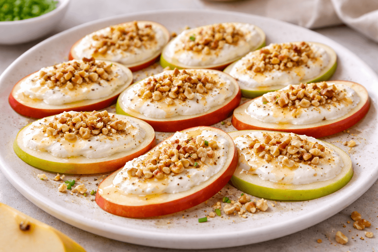 Las láminas delgadas le dan a la manzana una textura distinta y más delicada. Al combinarlas con queso crema o queso fresco, aparece un contraste dulce-salado que eleva el conjunto. Funciona mejor cuando el queso acompaña sin cubrir por completo el sabor de la fruta.