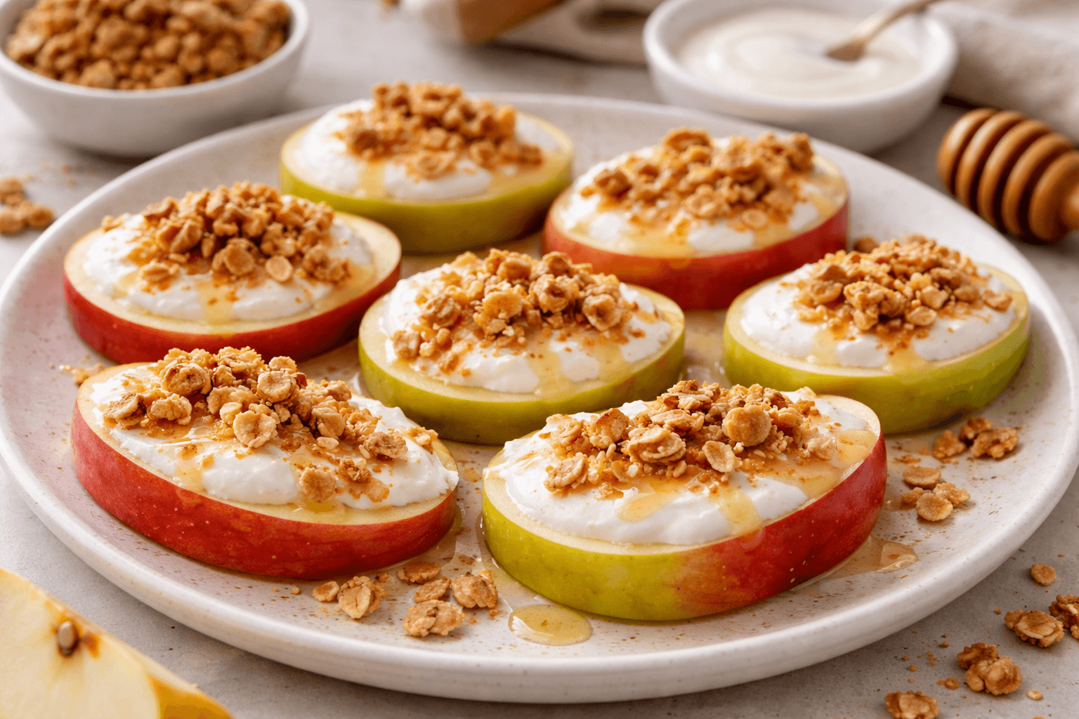 Las rodajas finas funcionan muy bien como base para armar bocados rápidos. Un poco de yogur natural encima y un toque de granola crean contraste entre lo fresco, lo suave y lo crujiente. Mantener las cantidades pequeñas ayuda a que siga siendo un snack ligero y fácil de comer.