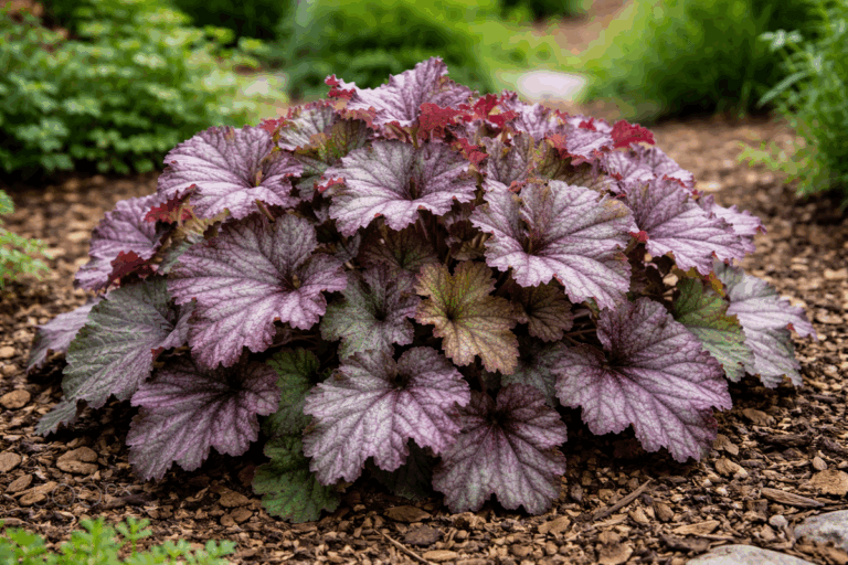 La heuchera es una planta perenne que destaca por sus hojas acorazonadas en tonos que van del verde al púrpura intenso. Incluso sin flores, aporta textura y contraste en bordes y macizos. Su follaje se mantiene atractivo durante gran parte del año, lo que la convierte en una opción versátil para dar color desde marzo.