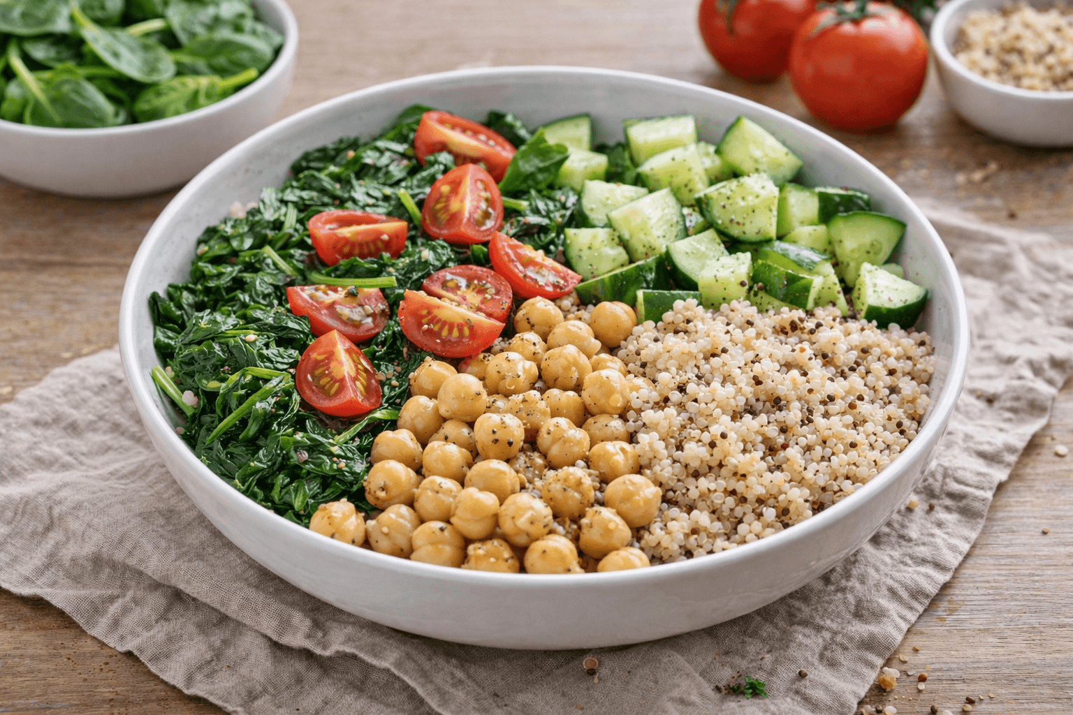 Sumar tomate, pepino o algún grano como arroz o quinoa ayuda a completar el plato. Este tipo de bowl no requiere mucha planificación y permite aprovechar una buena cantidad de espinacas de una sola vez.