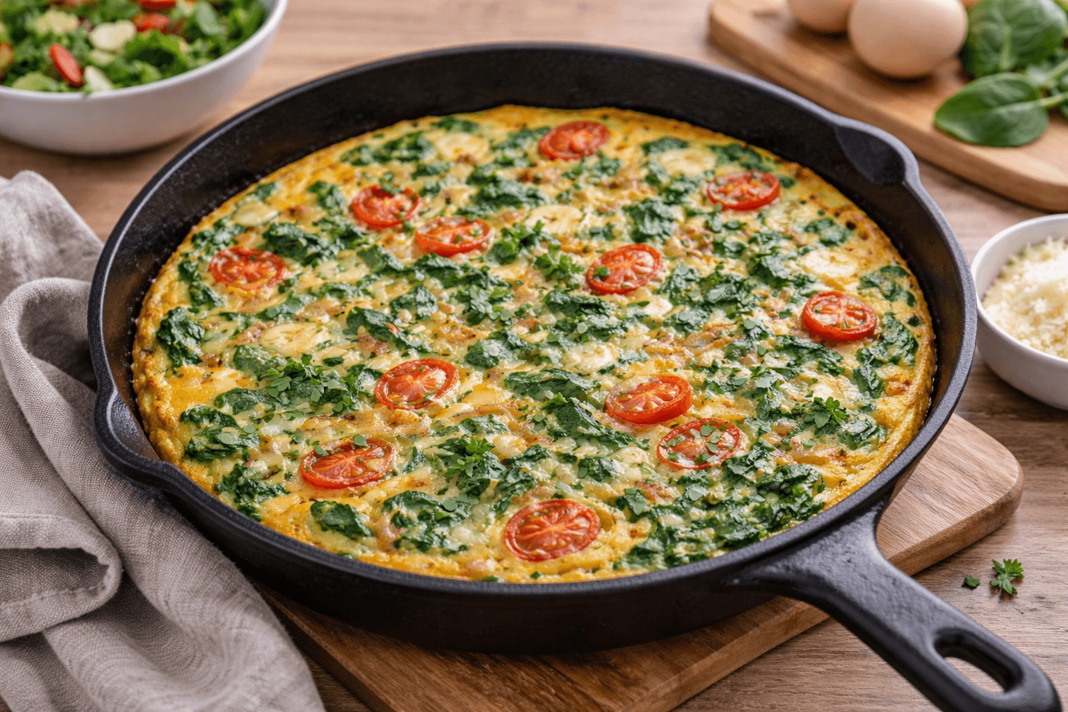 Una de las formas más prácticas de usar espinacas es preparar una tortilla. Puedes mezclarlas directamente con huevo batido junto a cebolla salteada, queso o incluso restos de verduras que tengas en la nevera.