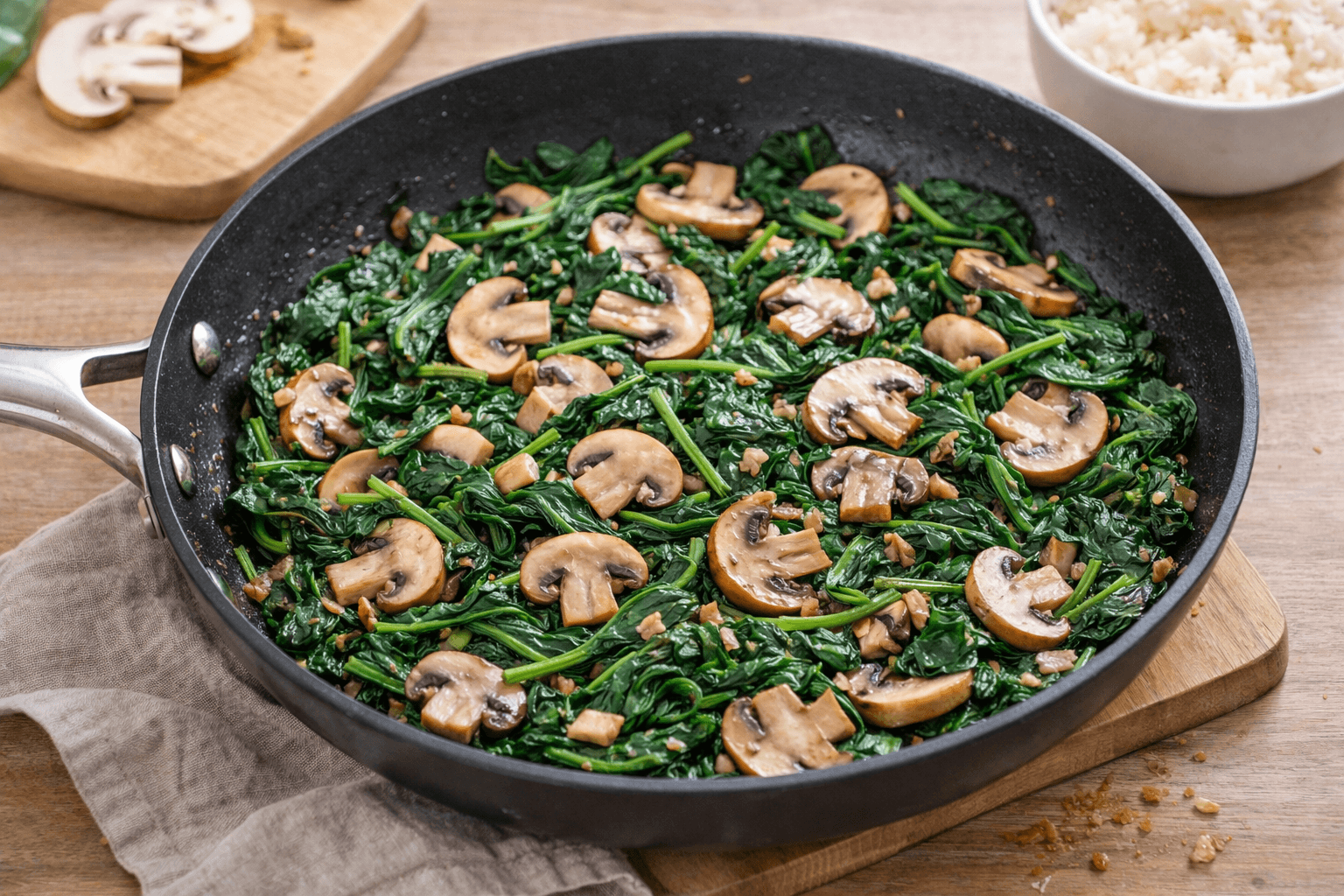 Basta con dorar ligeramente el ajo, añadir los champiñones y, al final, incorporar las espinacas para que reduzcan su volumen en pocos minutos. Este tipo de preparación funciona como guarnición o como base para acompañar arroz, pasta o incluso huevos.