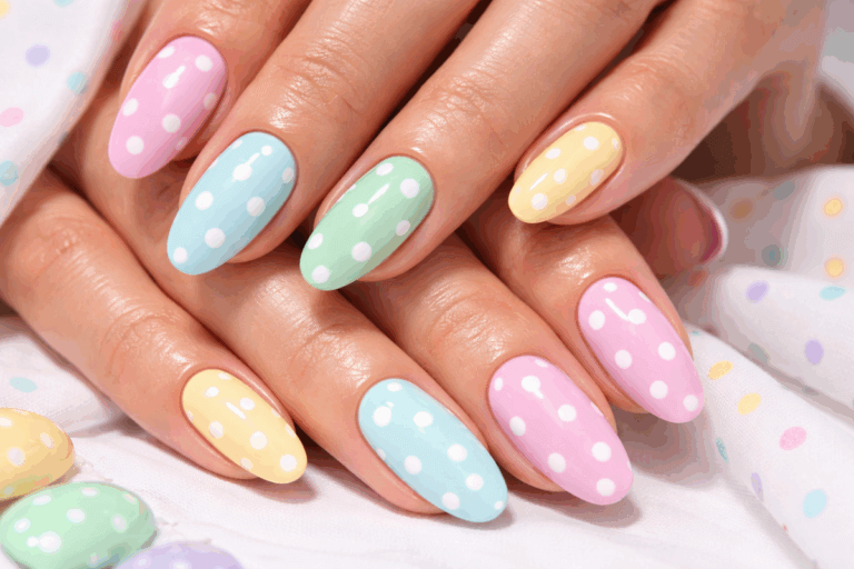 Si tu estilo es más romántico, los lunares en colores pastel como rosa, lavanda o celeste son una excelente alternativa. Al aplicarlos sobre una base clara, el resultado es suave y femenino.