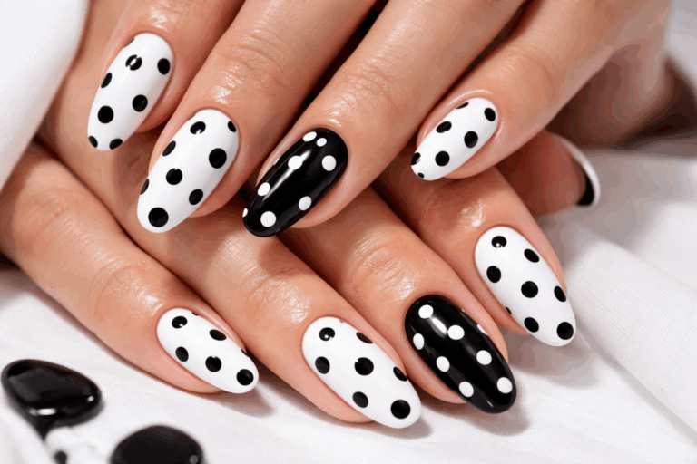 La combinación de blanco y negro nunca falla. Los lunares en contraste sobre una base neutra transmiten elegancia y seguridad. Puedes optar por puntos medianos, bien espaciados, para lograr un acabado limpio y moderno.
