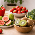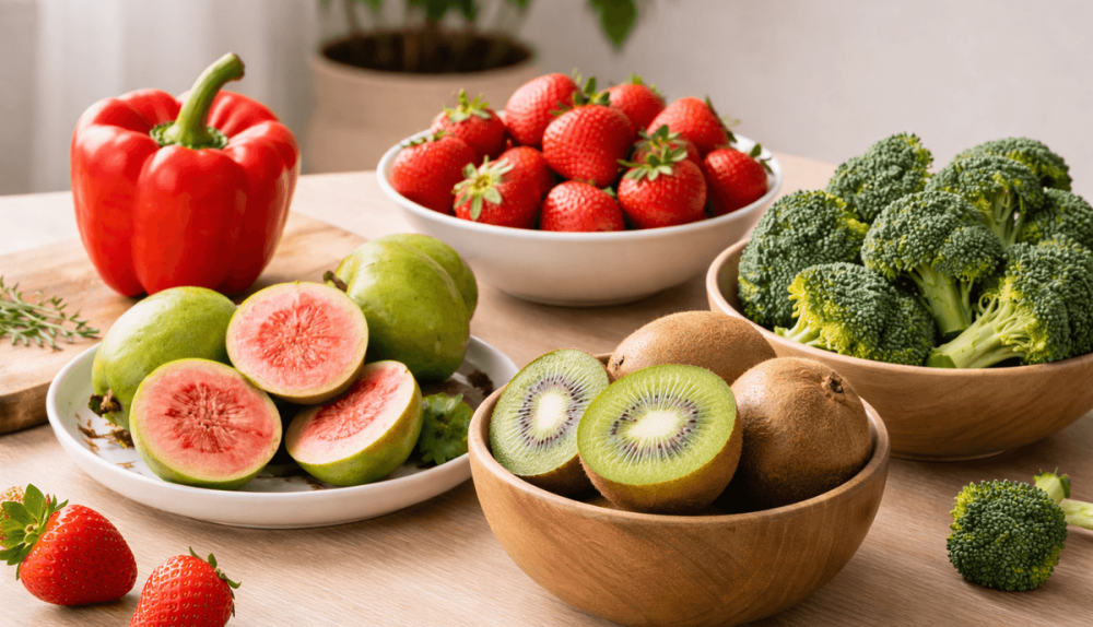 - Fuentes de vitamina C: brócoli, pimientos rojos, naranjas, mandarinas, limones, kiwi, fresas, papaya y guayaba.