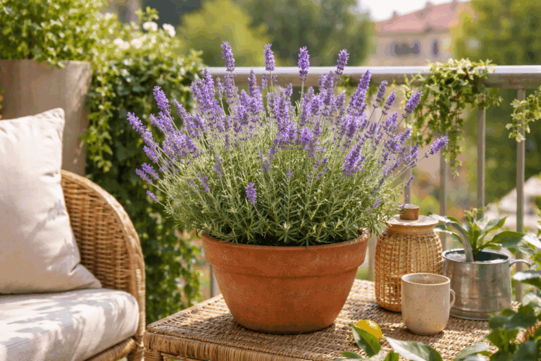 La lavanda es una de las plantas más resistentes al sol directo. Sus flores lilas aportan color y un aroma relajante que recuerda al Mediterráneo. Necesita riego moderado y un sustrato con buen drenaje. Además, atrae polinizadores como abejas y mariposas, lo que añade vida a tu balcón.